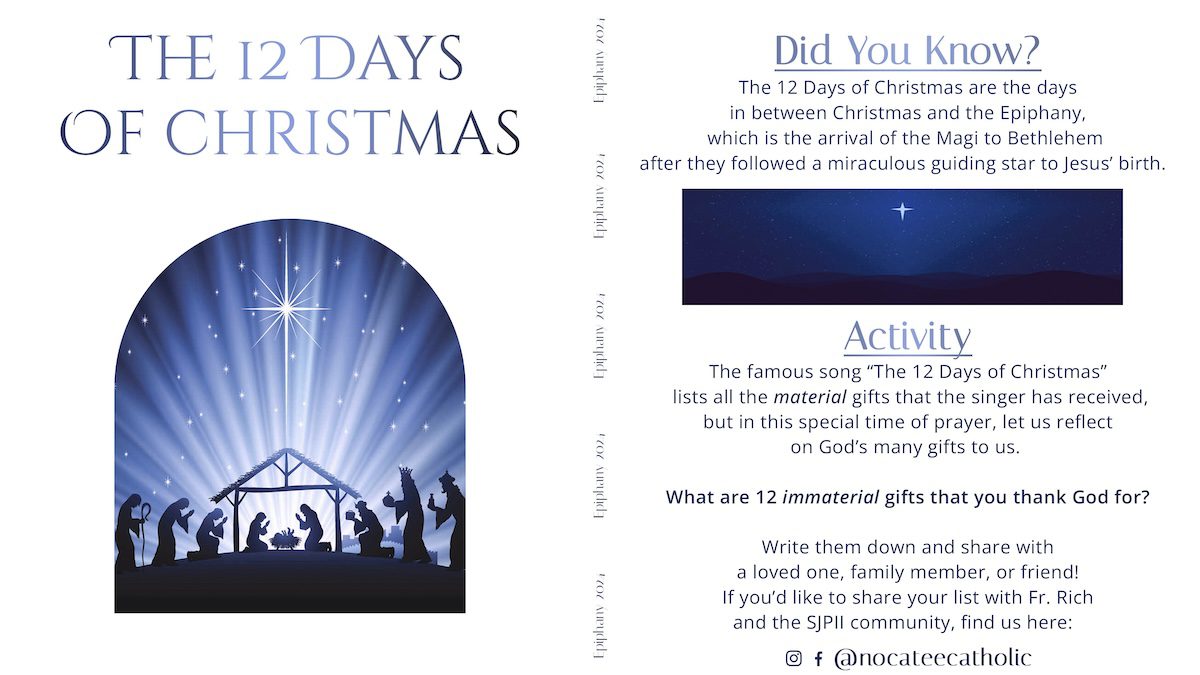 The 12 Days of Christmas are the days between Christmas and the Epiphany, which is the arrival of the Magi to Bethlehem upon Jesus' birth.